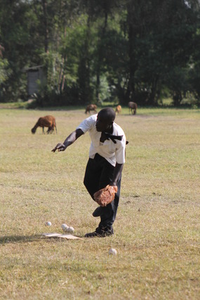 On Monday the 16th we began having baseball clinics at secondary schools around the Ahero area. In the next eleven days, we would play baseball at nine schools and an orphanage in Ahero (two of them twice), one school in Kakamega, and one school in the Masai Mara (three visits). On Saturday we held an all-day tournament, with eight teams and nine games. Many of the students shed their school shoes and played in bare feet. Two girls at the tournament, on opposing teams, took turns using a shared pair of shoes. Many of the players are orphans.